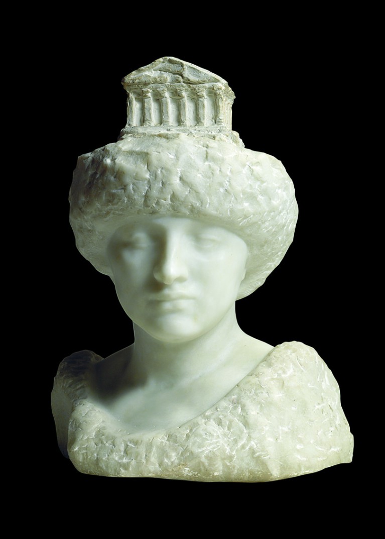 One of  Rodin’s sculptures explore Ancient Greek inspiration more explicitly. His work ‘Pallas (Athena) with the Parthenon’ was based on an original sculpture he made of his friend’s wife, Mrs Russell. In this updated work, the woman is depicted as the goddess Athena with the Parthenon on top of her head. In doing so, Rodin harnesses the symbolism and mythology of ancient Greece and married it with his contemporary experience, thereby emphasizing his admiration and respect for his sitter as well as for the country that inspired him.