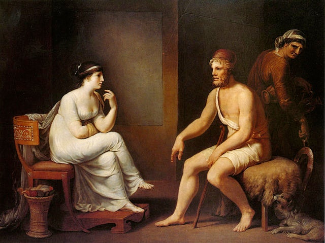 One by one the suitors tried their hand, but none could even string the bow let alone shoot an arrow with it through the axes. Then one of the beggars who was accustomed to feeding off the scraps the suitors left asked if he could try his hand. The suitors laughed, but were amazed to see him string the bow with ease and fire it all the way through the 12 axes. The beggar then turned his weapon on the suitors and shot them one by one. Penelope looked at the carnage. "Does this mean I must marry a beggar now?" she asked. "I am no beggar," he said, "but Odysseus, your husband."